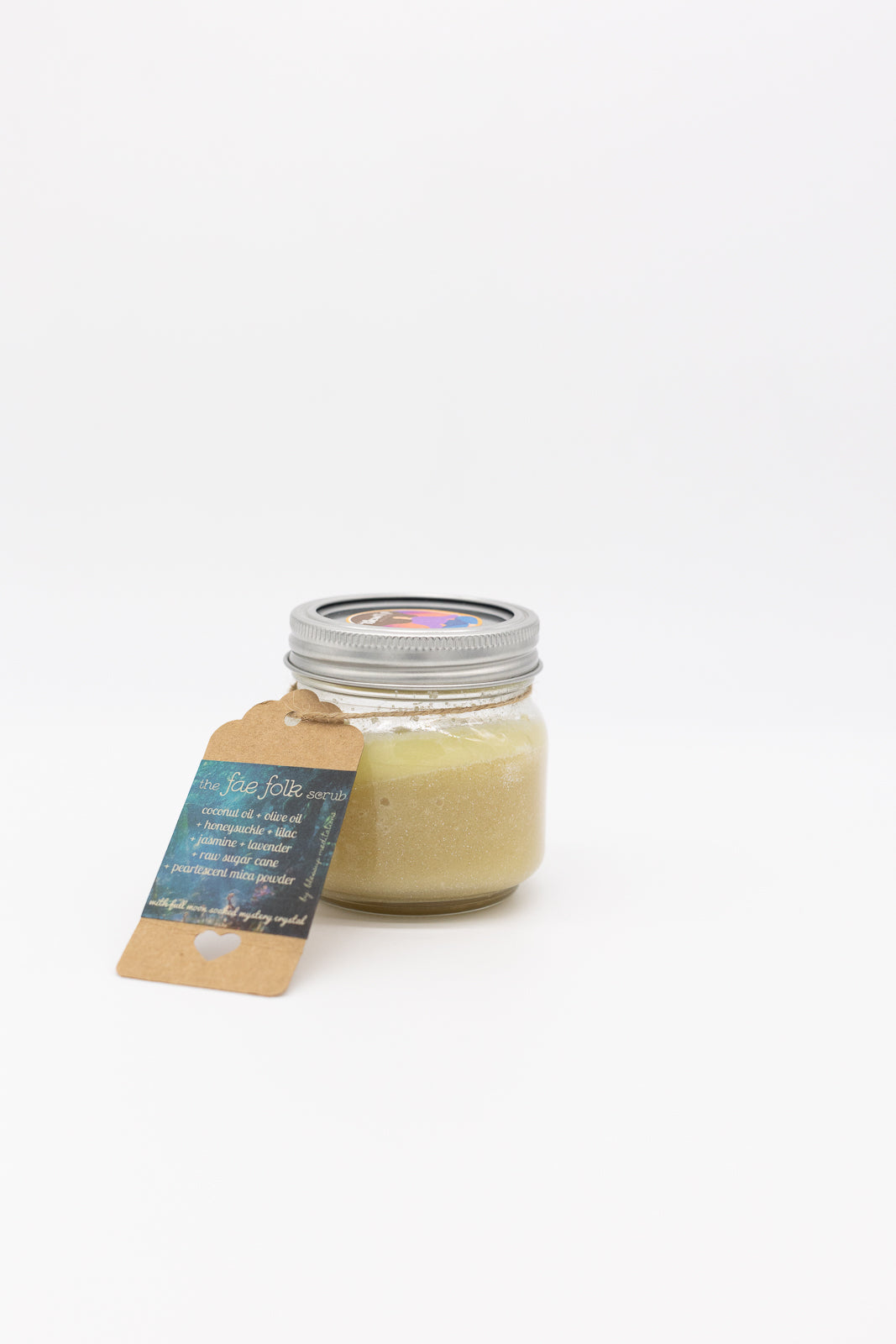 Sugar scrub blend of Honeysuckle, Lilac, Jasmine, and Lavender all wrapped up in a oil combination of Coconut and Olive oils, topped with pearlescent mica.