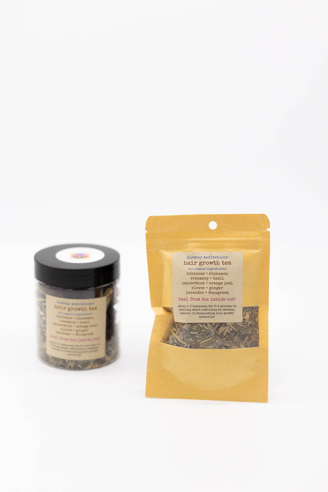 Made with all organic ingredients: Hibiscus, Cinnamon, Rosemary, Basil, Peppermint, Orange Peel, Cloves, Ginger, Lavender, Fenugreek