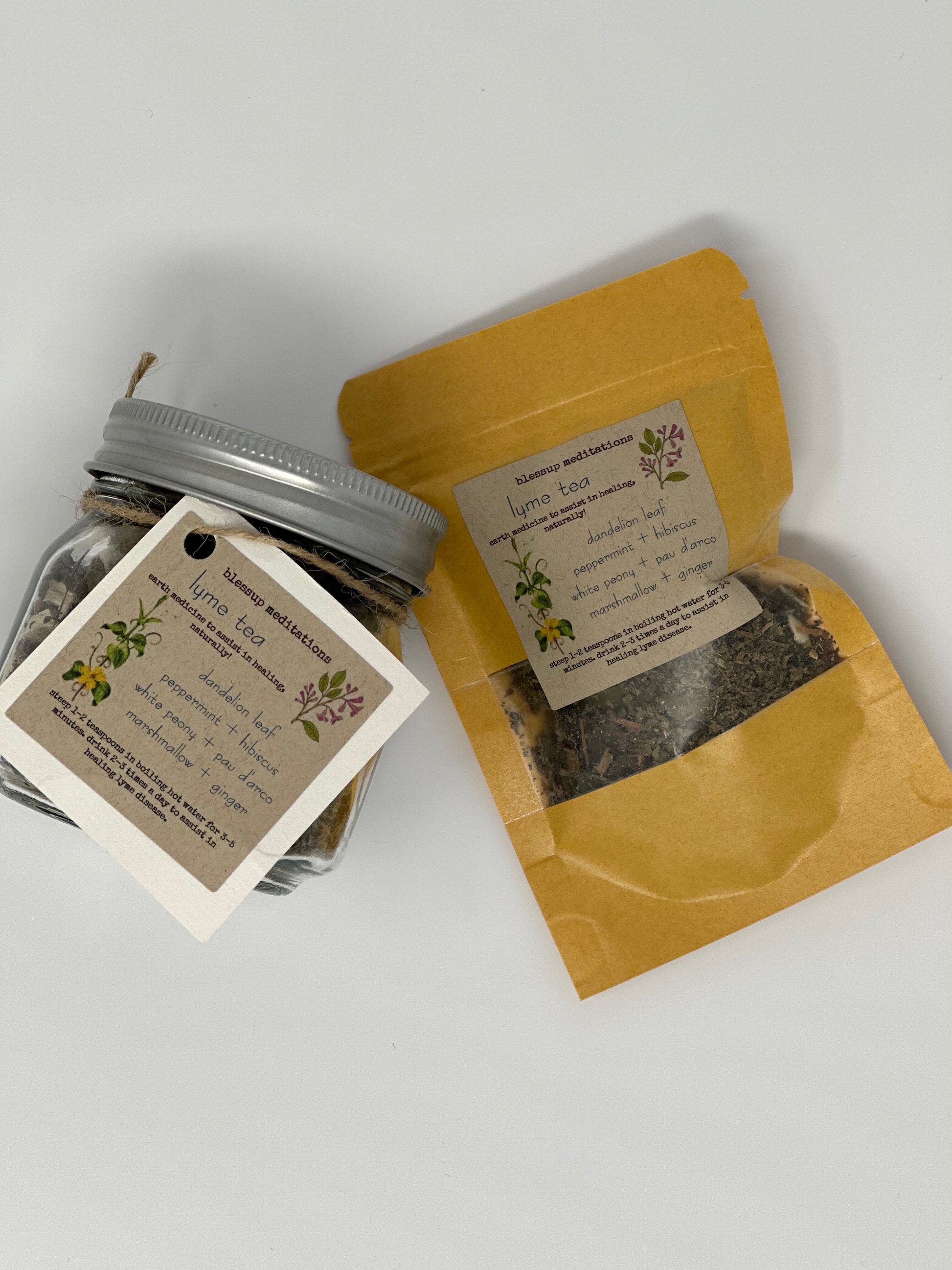 Dandelion leaf, peppermint, hibiscus, white peony, pau d'arco, marshmallow, and ginger.