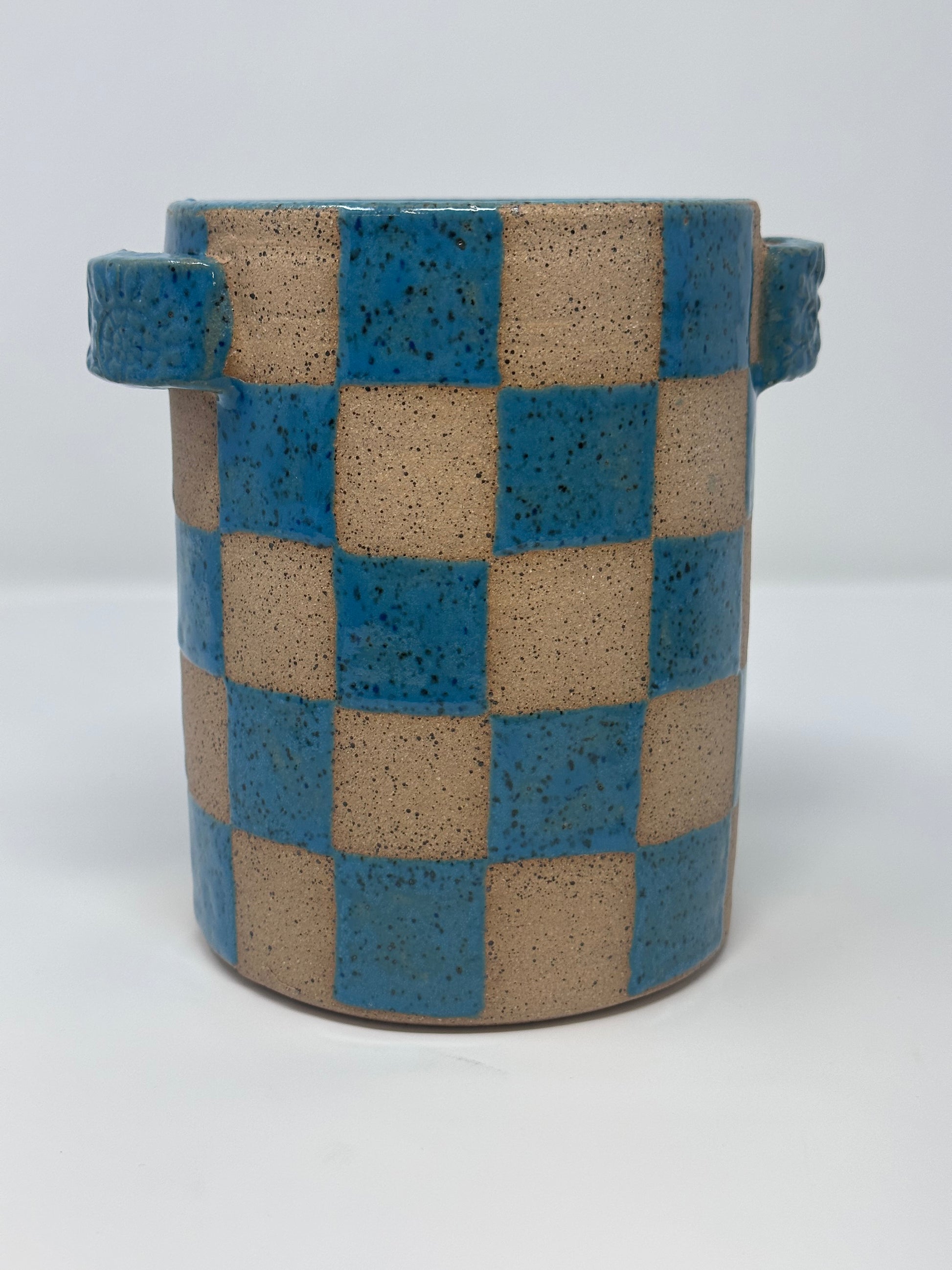 Handmade ceramic bottle chiller - perfect size for any wine or liquor bottle. A perfect gift alone or with matching tumblers! Choose from turquoise checker design or white speckle with gold leaf trim!