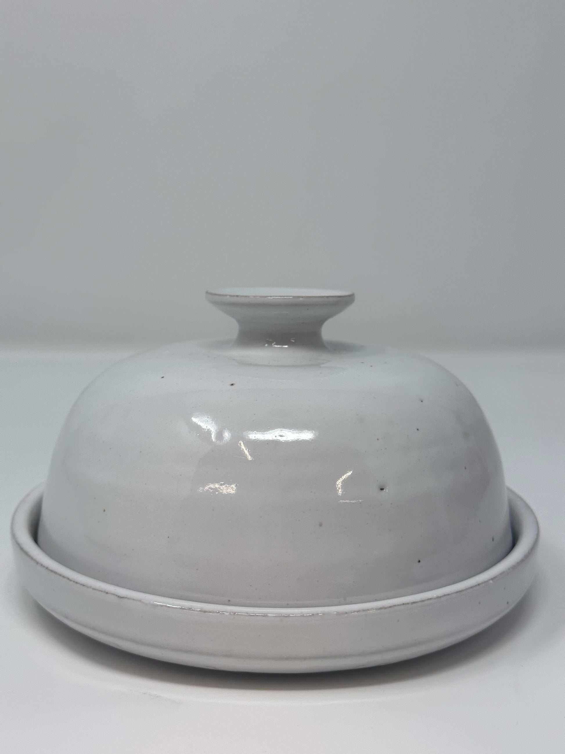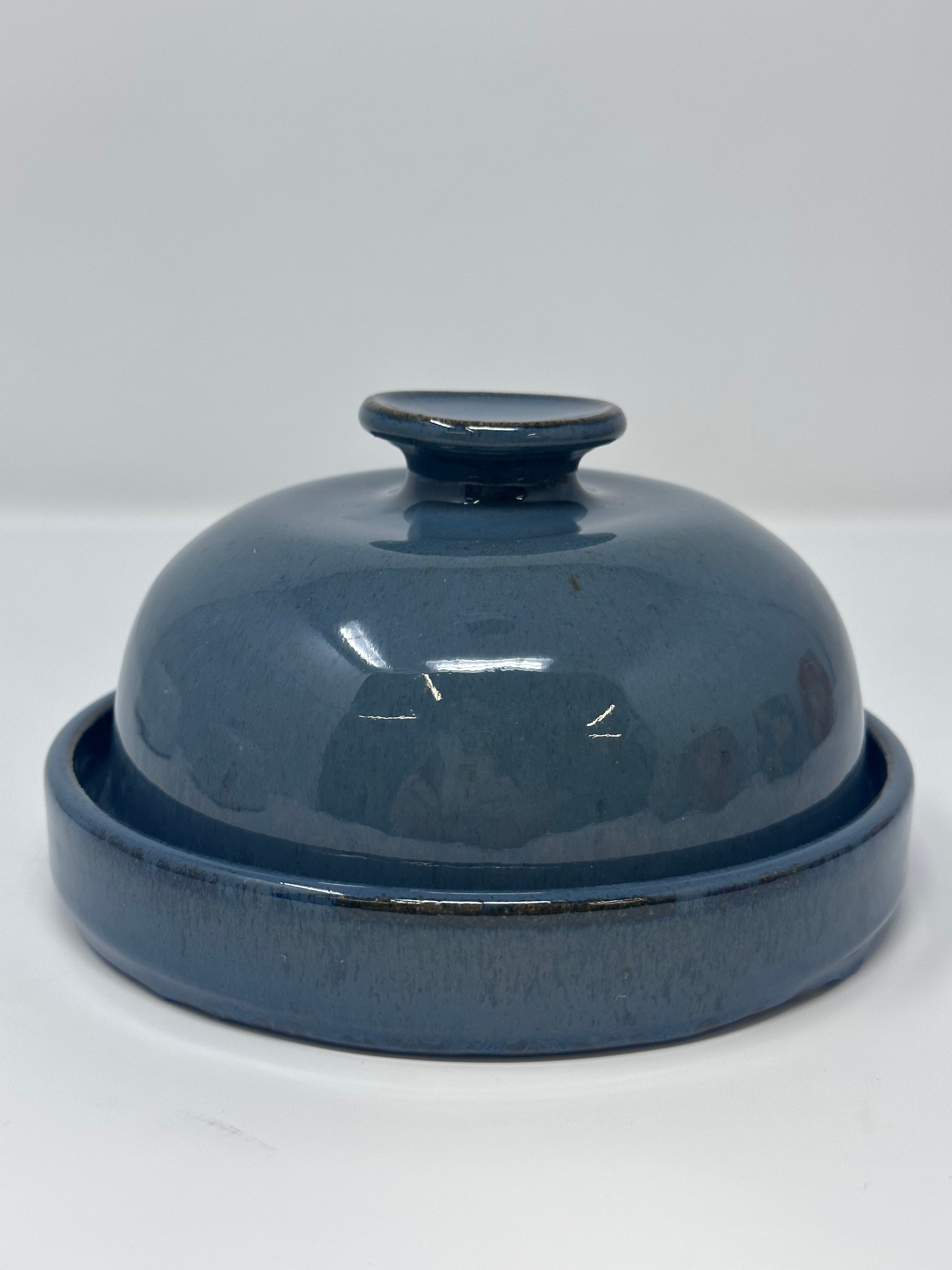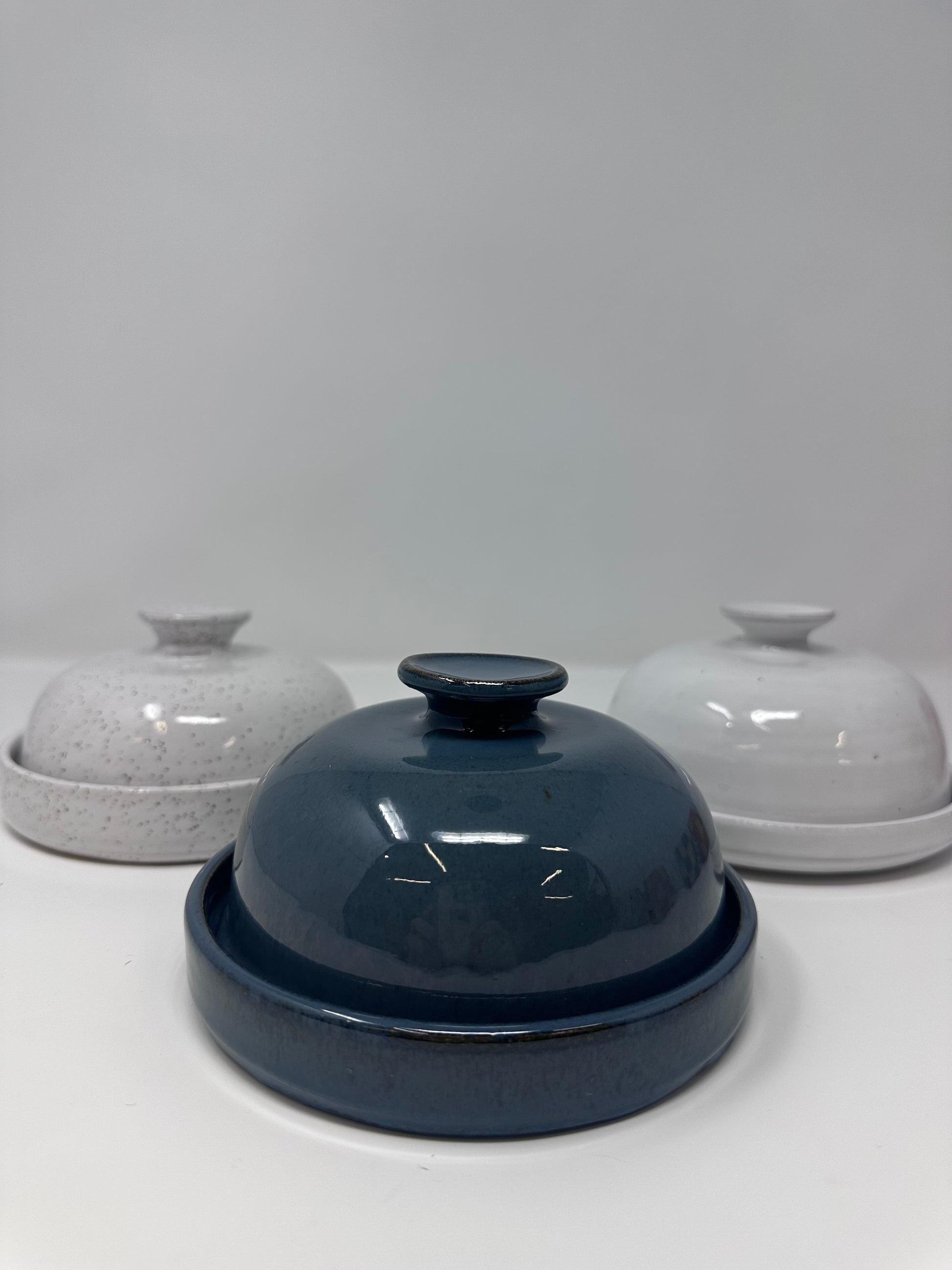 Handmade ceramic butter dish made right here in Loudoun County, VA. This unusual rounded design dresses up any counter or table - choose from blue, white, or white with speckles.