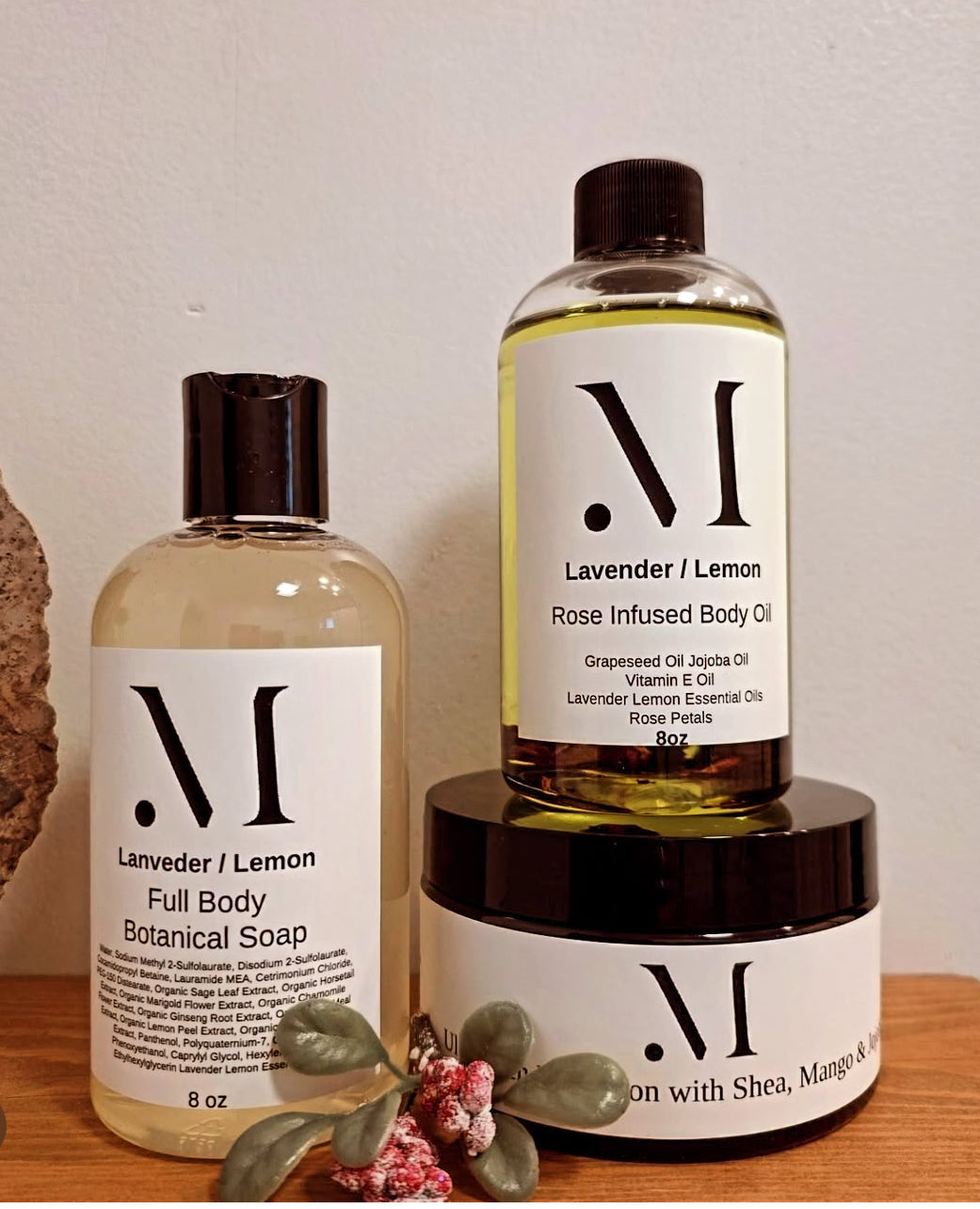 Envelope yourself in nourishing botanicals head to toe! Set includes liquid soap, Infused body oil, and ultra-rich hydrating body cream.