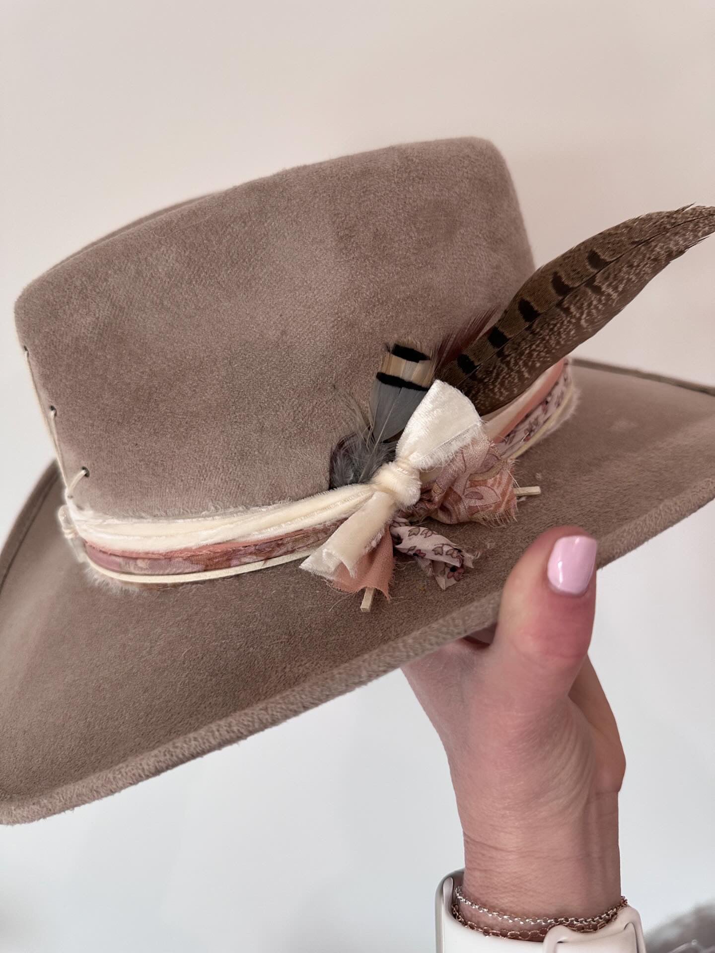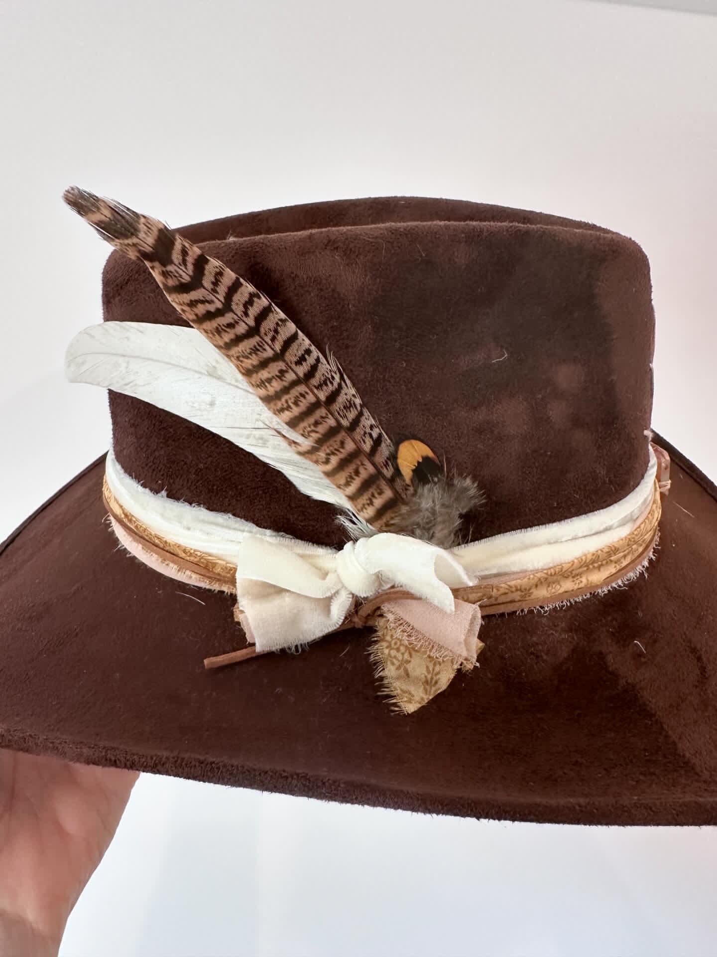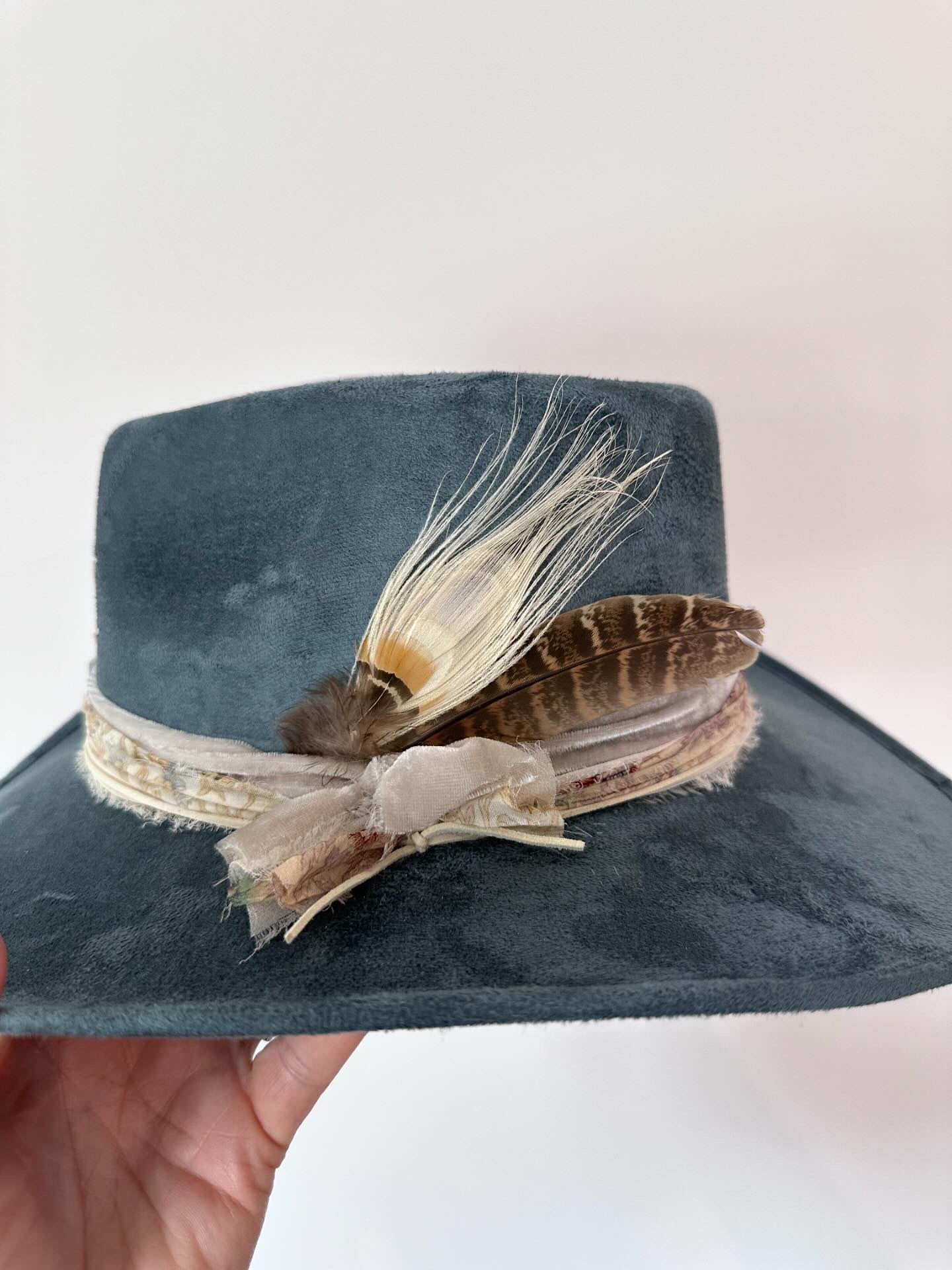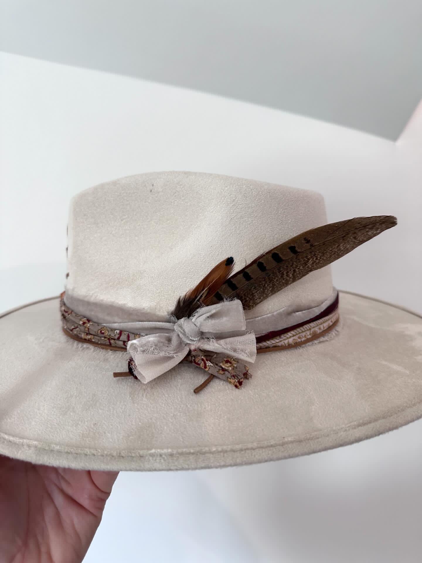 Choose from 'Cowboy' or 'Fedora' (we call it the Lainey Wilson' style. All are handmade, one of a kind using vintage saris for accents, leather stitching and accents, and good vibin' crystals to boot!