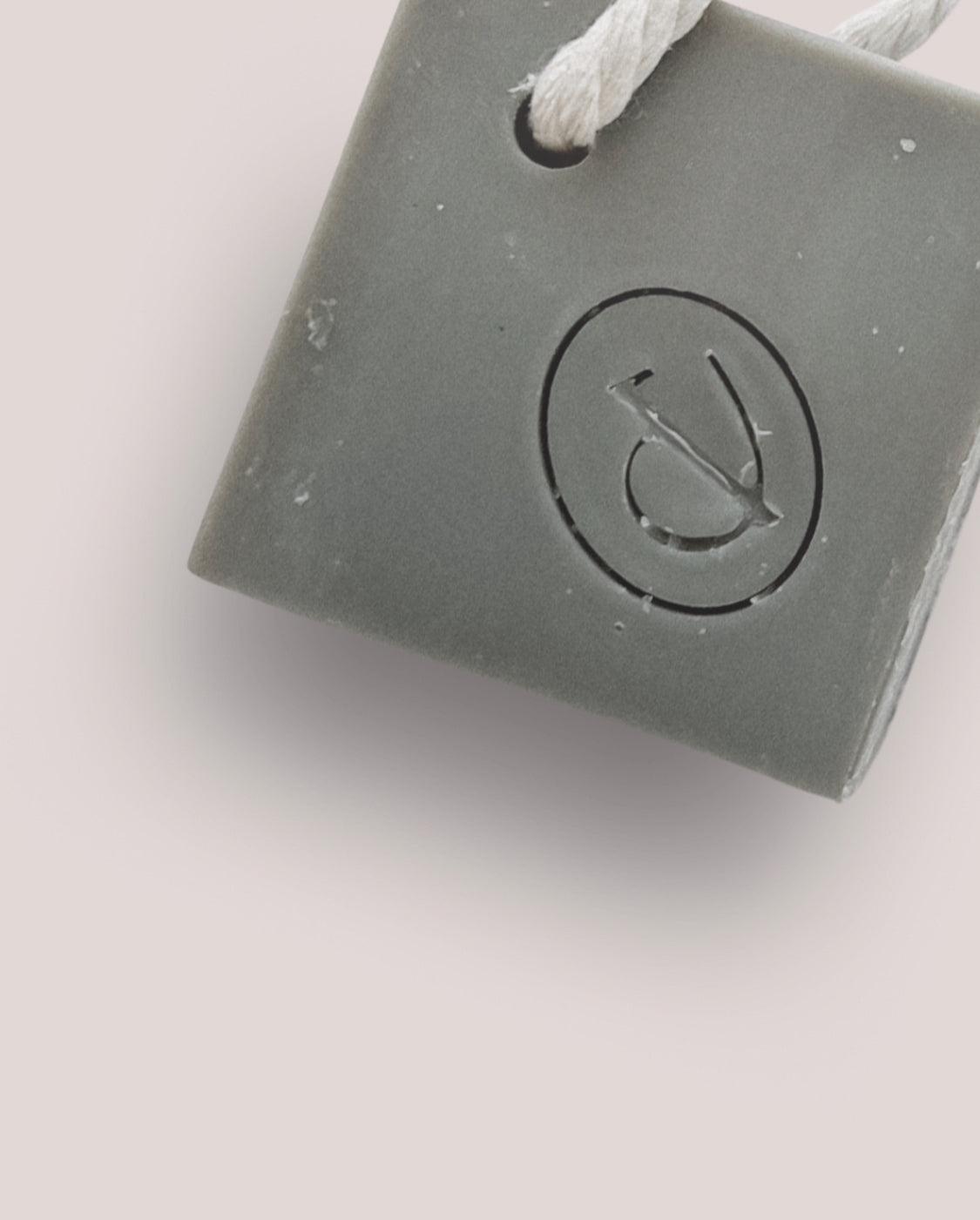 Notes of Balsam and Mint and colored with pure Indigo. These cubes are 50% bigger than our standard slices and are perfect to use in the shower and to hang over the faucet at your kitchen sink.